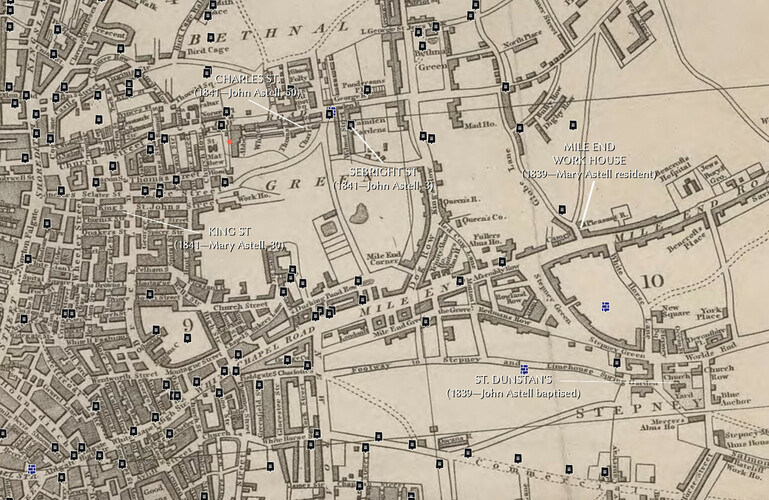 What we know for sure is that John Astell's mother was called Mary, who was a single mother who lived in Mile End Old Town, perhaps at the workhouse. That's not a lot to go on.